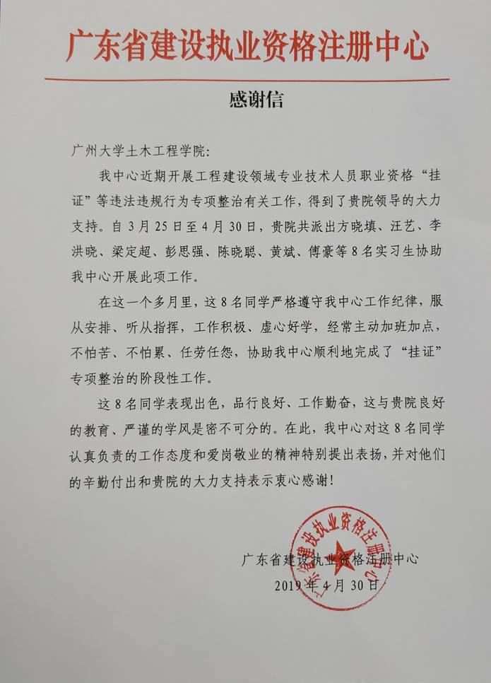 受广东省建设执业资格注册中心委托,威尼斯vip官网指派方晓填、汪艺、李洪晓、梁定超、彭思强、陈晓聪、黄斌、傅豪等8名研究生,协助该中心开展工程建设领域专业技术人员职业资格“挂证”等违法违规行为专项整治有关工作。上述8名同学在协助工作的3月25日至4月30日期间,不迟到不早退,服从安排、听从指挥,积极工作、虚心好学,工作勤奋、不怕辛苦,得到了该中心的高度认可、表扬和感谢!(附资格注册中心感谢信)