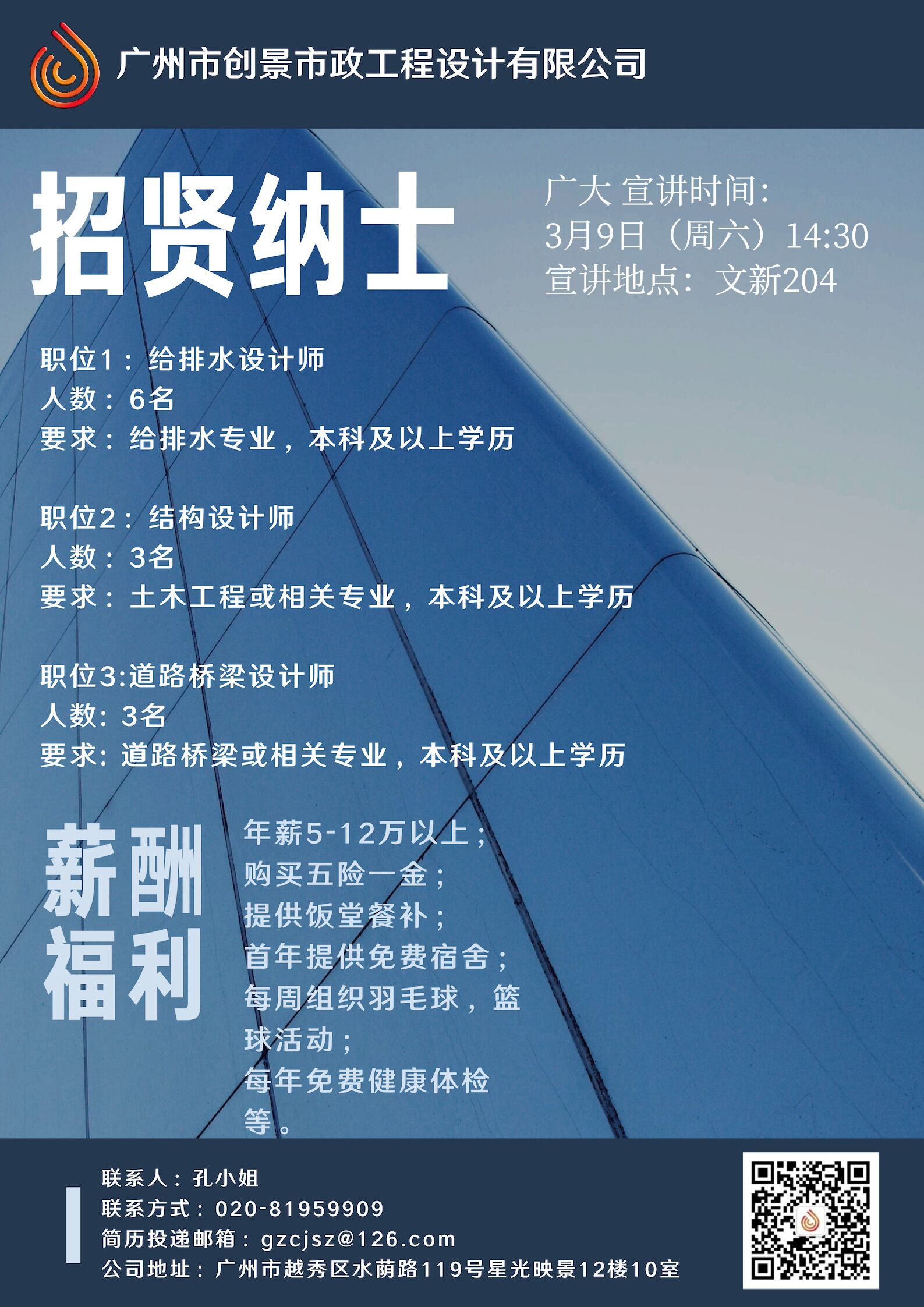 公司位于广州市越秀区水荫路甲级写字楼星光映景大厦。办公环境优美,周边交通便捷,配套职工饭堂宿舍。现因业务发展需要,广纳贤才,招聘数名: